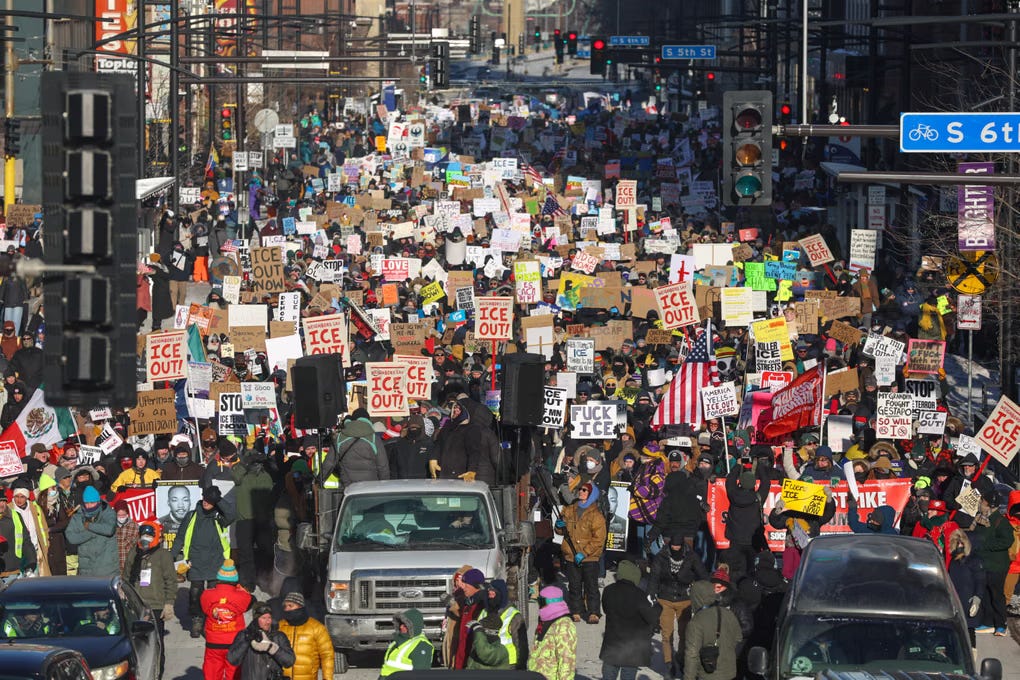 We are seeing some of the most solid organizing in Minneapolis. They proved that a citywide general strike could be done. In below freezing temperatures, tens of thousands of people showed up on a work day to demand “ICE OUT.” More than 700 businesses across the state closed their doors for an economic blackout, according to Democracy Now! CEOs of Minnesota’s largest employees, including Target, Mayo Clinic, and various sports team, signed onto a letter calling for deescalation.